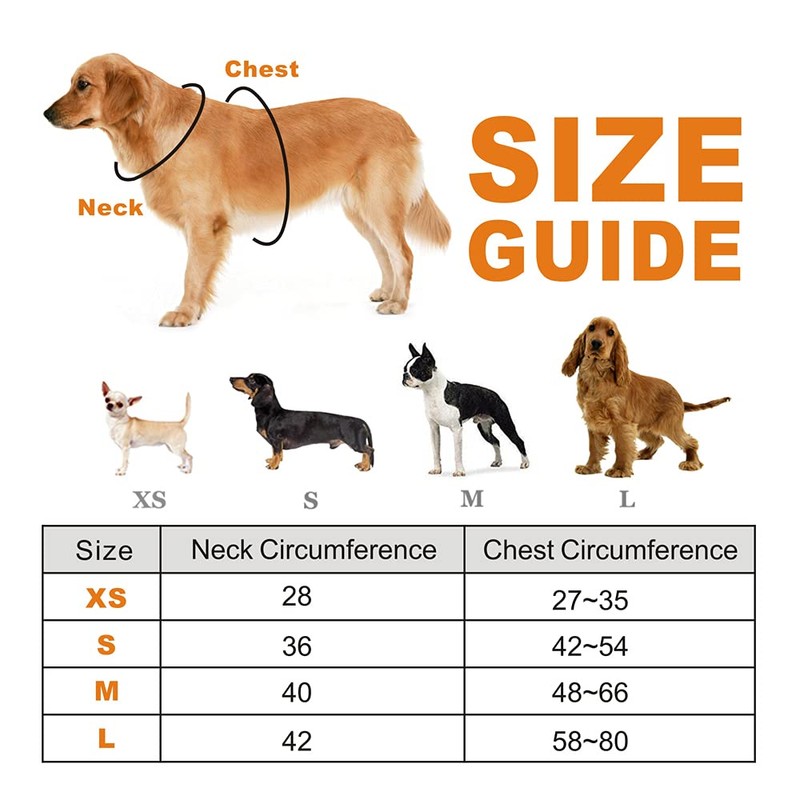 • Neck Circumference: XS 28cm S 36 cm M 40cm L 42cm, Chest Circumference: XS 27~35cm S 42~54cm M 48~66cm L 58~80cm