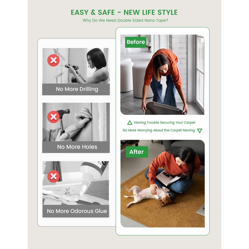 - Nano-tech Tape: Our heavy duty double sided tape uses advanced nanotechnology and is made of high-quality acrylic gel, which can be installed quickly and safely without drilling and nailing.