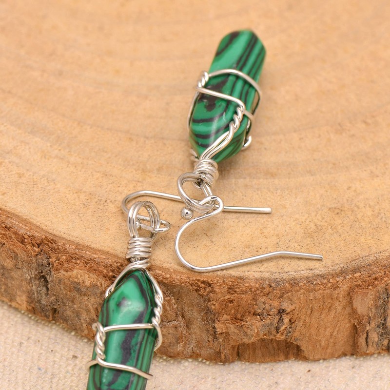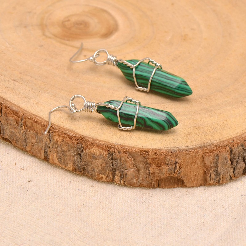 Paialco Hand Wired Created Malachite Healing Crystal Point Chakra Dangling Earrings
