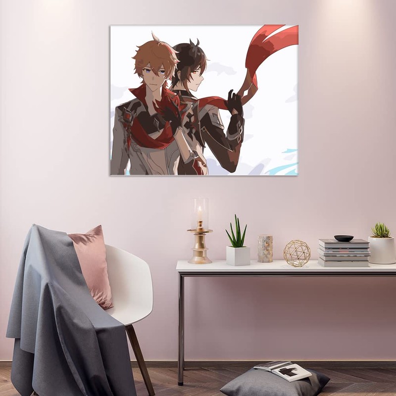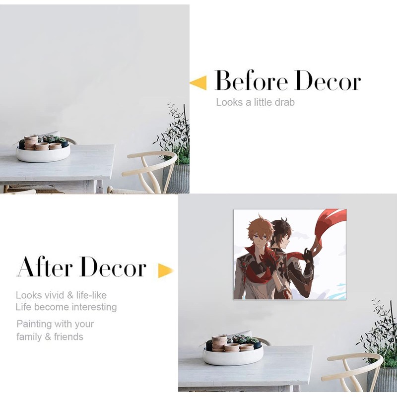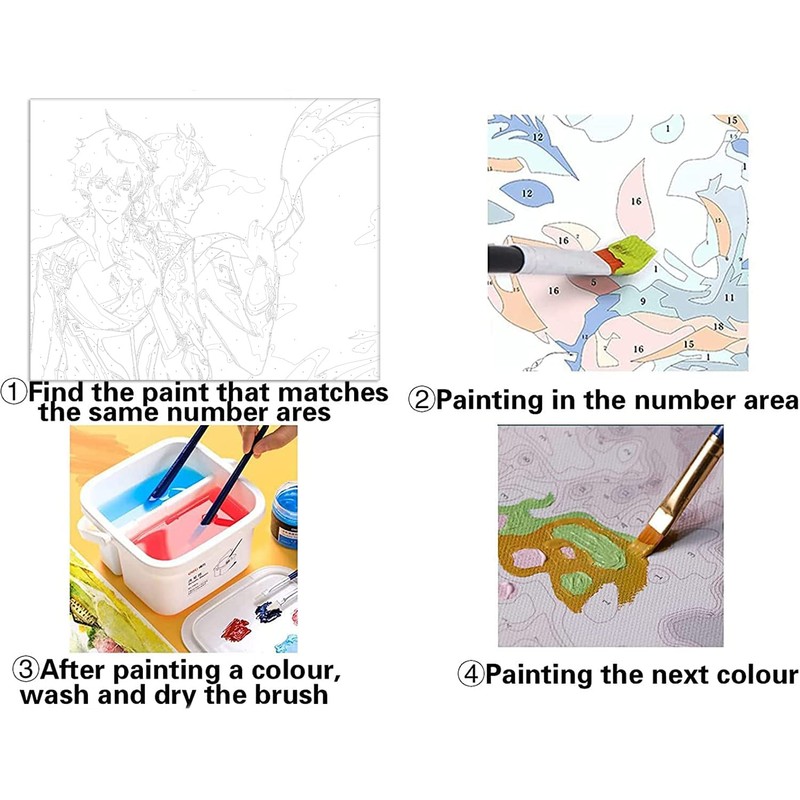- ✿ What you get: 1 Genshin Impact pre-printed canvas (without frame), 1 set of acrylic paint, 3 high-quality brushes, 1 wall hanging kit, 1 colored postcard guide, 1 paper copy numbered canvas for reference