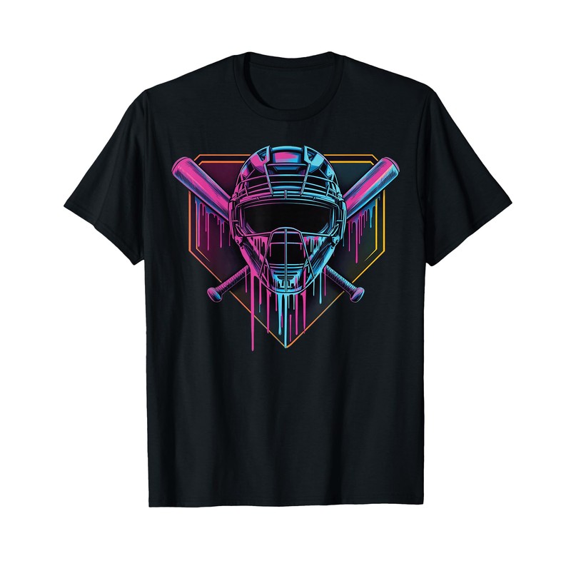 - Colorful baseball design with a retro baseball catcher mask and baseball bats. Bold catcher mask with crossed bats in colorful gradient hues and dripping paint style. Retro street art meets baseball culture in this eye-catching design.