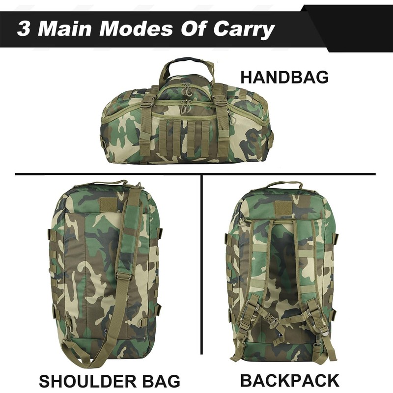 - 【Practical Gym Bag】There are 3 main modes of carry:as a Handbag, Shoulder Bag and Backpack.The middle handle is nice and beefy with foam around it for comfort. The shoulder strap is detachable, another special design is that the backpack strap can be hidden in the zipper compartment at the bottom.Molle webbing throughout for attaching additional tactical pouches or all the gear you need