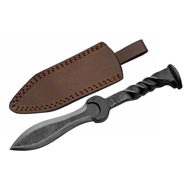 9.75" (24.77cm) overall. 4.75" (12.07cm) double edge stainless blade. Railroad spike handle. Brown leather belt sheath. Boxed.