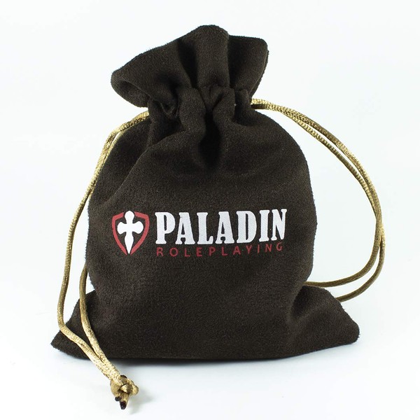 - Beautiful super-soft faux suede (soft leather effect) pouch, with drawstring cord and Paladin Roleplaying logo