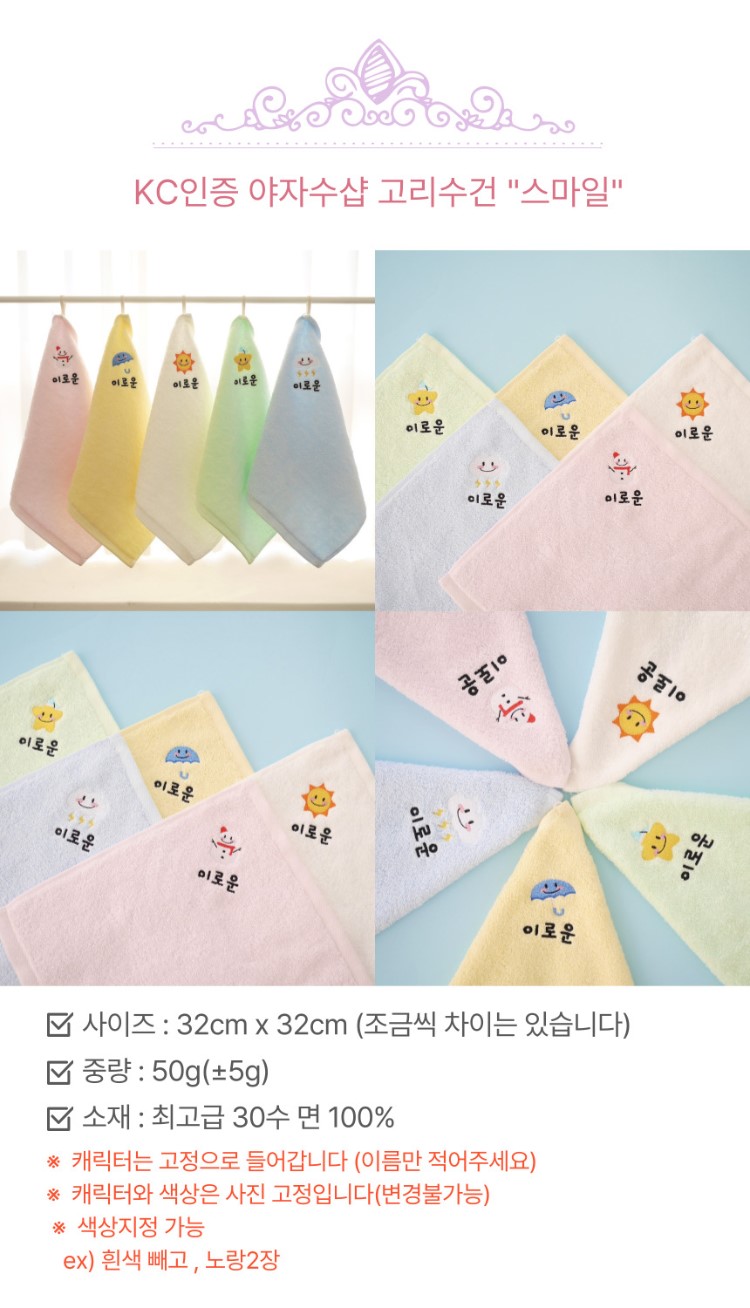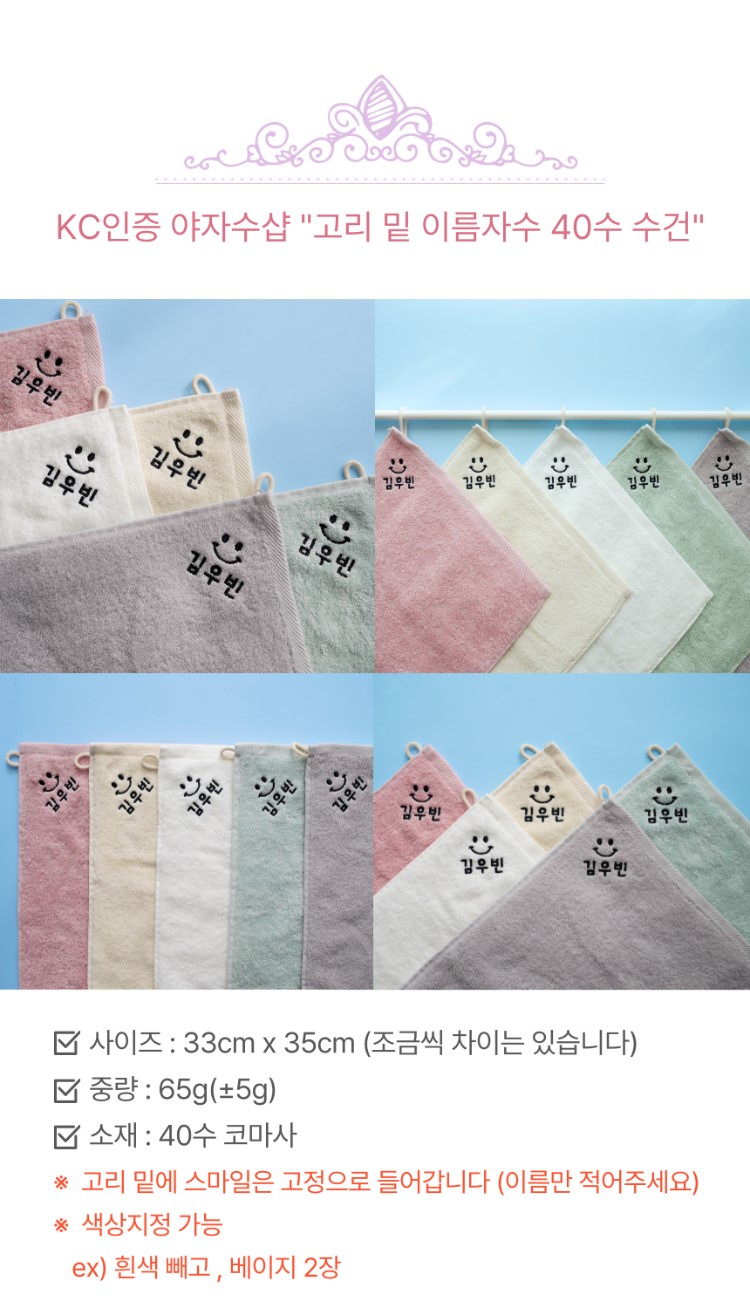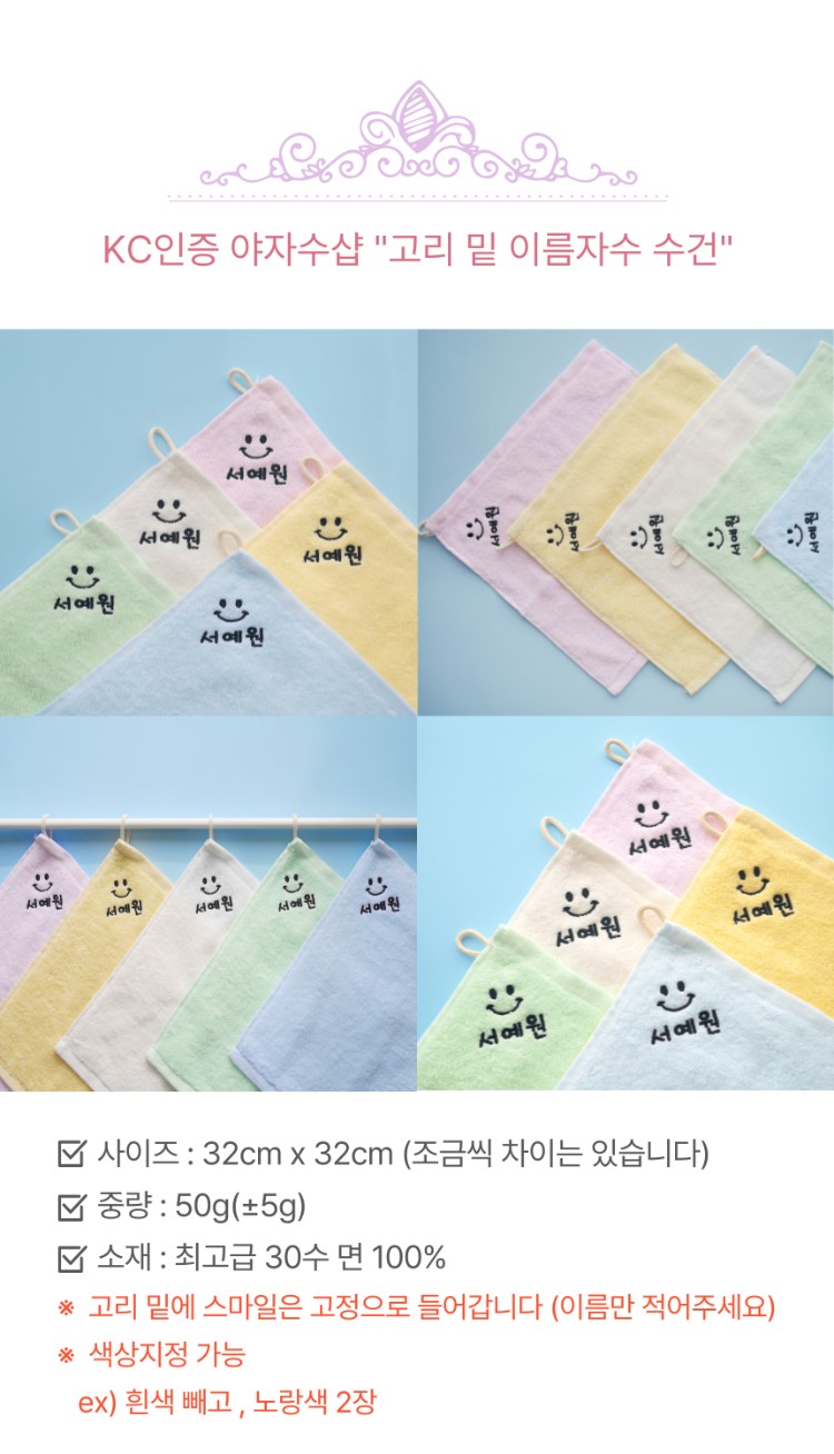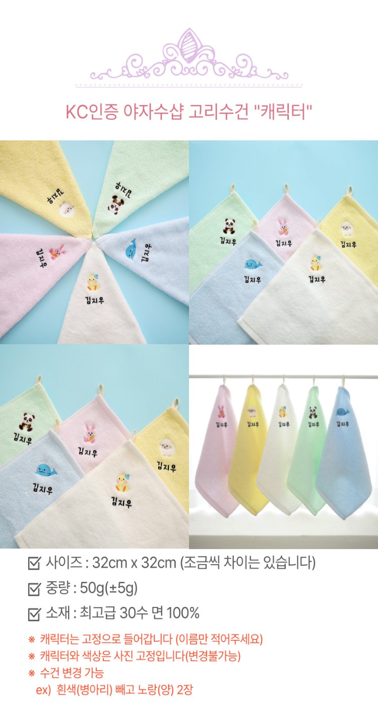 Palm Tree Shop KC certified daycare kindergarten 5-piece ring towel set, 40-count name embroidery wink 5-piece ring towel set / 야자수샵 KC인증 어린이집 유치원 고리수건 5매 세트, 고리수건 40수 이름자수 윙크 5매세트