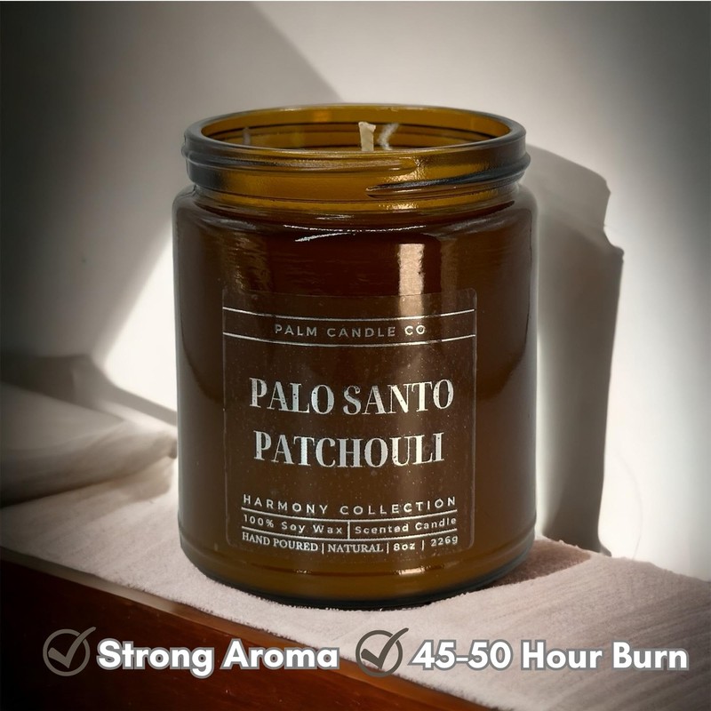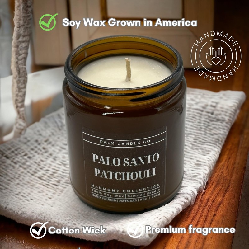 Palo Santo Patchouli Harmony Collection 8 oz Aromatherapy Soy Candle: Elevate Your Atmosphere at Home and Office Non-Toxic, Relaxing Ambar Glass Jar Candle in a Gift Box