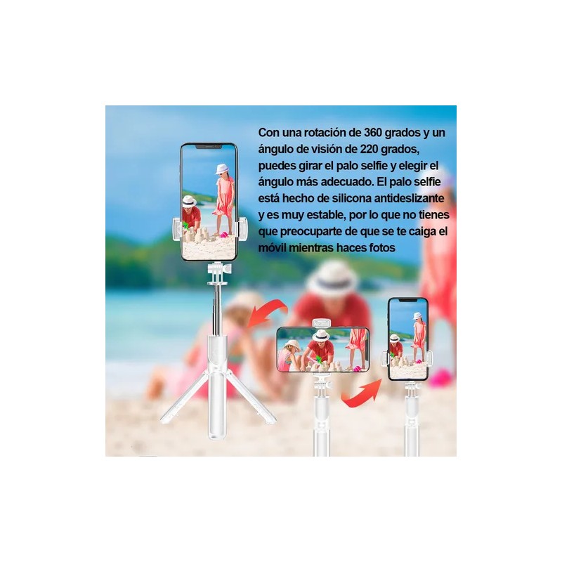 Este producto es un palo selfie con soporte para teléfono móvil y luz tricolor de regalo