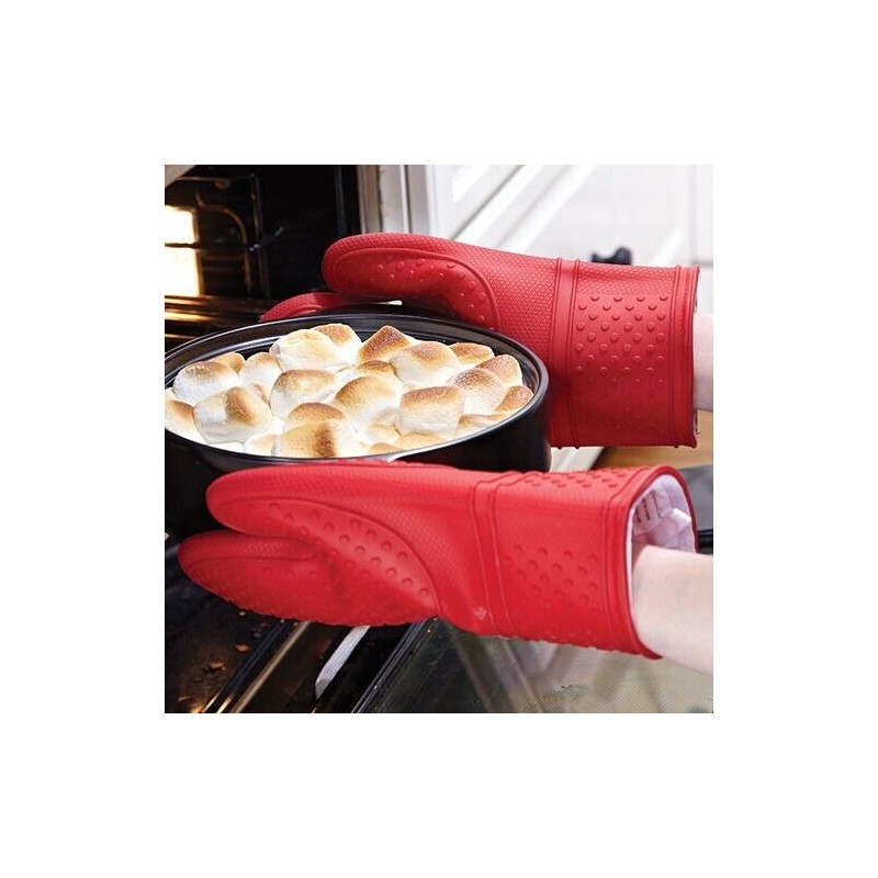 Our waterproof Silicone Oven Mitt Set is designed to help you beat the heat. They contour to your hands, so you’ll always have a secure grip. Since they're nonporous and waterproof, you can use them to lift corn, lobster, or ribs from boiling water, or to transfer whole chickens or roasts. Plus, they have a comfortable lining to keep your hands protected.