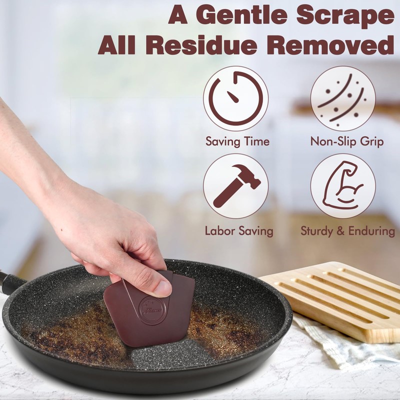 - π¦π§π¨π₯ππ¬ π ππ§ππ₯πππ - The pan scraper tool is made of high-quality ABS plastic which is non-toxic, odorless, non-sticky and non-scrack, reusable and food safe. The dish scraper tool is dishwasher safe with heat resistant up to 215FΒ°