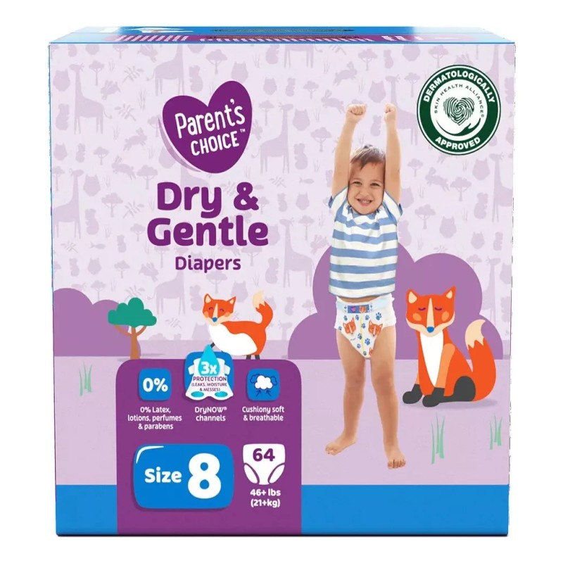 Los pañales Parent’s Choice Etapa 8 están diseñados para brindar comodidad, seguridad y máxima absorción a bebés de mayor peso, desde 23 kg en adelante. Su tecnología de núcleo ultraabsorbente mantiene la piel seca por hasta 12 horas, protegiendo contra fugas y evitando irritaciones.