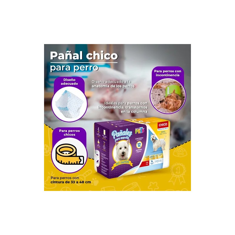Paquete pañales para perro chico con 12 piezas.