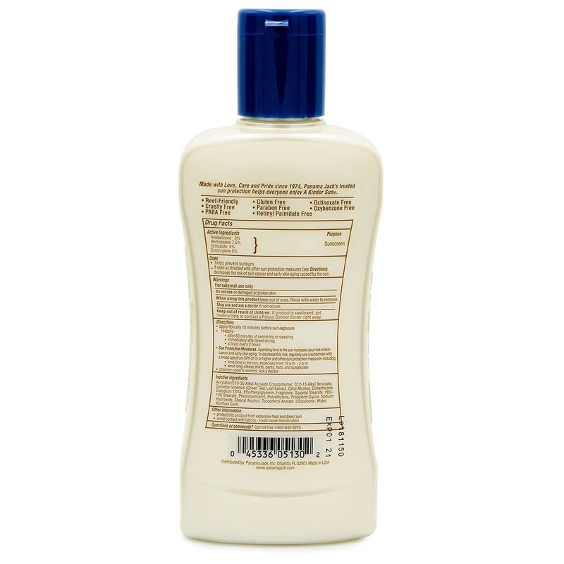 MULTI-ACTION FORMULA: Our Panama Jack sunscreen lotions delicately combines antioxidants with moisturizing oils and a tropical fragrance in a reef- friendly, broad spectrum UVA/UVB formula. DESIGNED FOR SUN & OCEAN LOVERS: Helping to achieve your desired amount of sun protection, this multi- functional suntan lotion is Cruelty Free and does NOT contain: PABA, Gluten, Paraben, Retinyl Palmitate, Octinoxate or Oxybenzone. BROAD SPECTRUM SUNSCREEN: With SPF 15 (Sun Protection Factor), this Panama Jack water resistant (80 minutes), UVA-UVB sunscreen lotion is best for use by fair/sensitive skin types that tan slowly and burns easily. 6 FL OZ (177 mL) easy-to-grip consumer-friendly bottle with dispensing flip cap. Use often and reapply after toweling dry, prolonged swimming, or excessive perspiration. SUN PROTECTION MEASURES: Spending time in the sun increases your risk of cancer and early skin aging. To decrease this risk, regularly use a sunscreen with a broad spectrum SPF of 15 or higher and other sun protection measures including wearing hats and sunglasses.