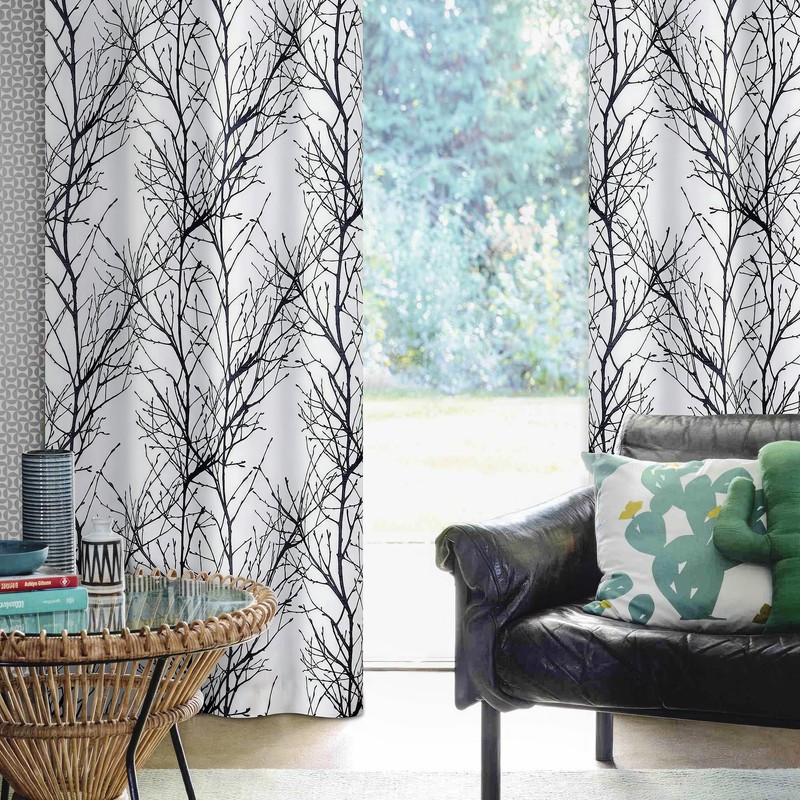 - Impresión de ramas de árbol negro en cortinas blancas para aumentar el espacio y añadir un poco de interés visual brillante.