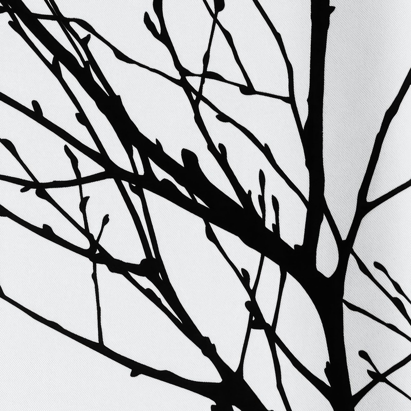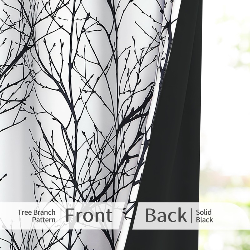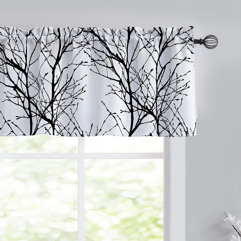 - Cortina opaca con cenefa: 1 panel, impresión de ramas de árbol negro en cenefa de ventana blanca. 50 pulgadas de ancho x 18 pulgadas de largo. Panel, bolsillo para barra.