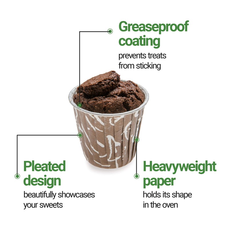 Get rid of flimsy muffin cups and boring paper baking cups! Make sure your delectable desserts and freshly baked treats are absolutely irresistible with these pleated paper baking cups -- covered in a tantalizing chocolate brown and white swirled print. From our bestselling Panificio collection, these tall cupcake cups are ideal for easily baking and serving beautiful red velvet cupcakes, blueberry muffins, chocolate souffles, and more. Their reinforced rolled rim expertly holds its shape in temperatures up to 425 degrees, while their grease-resistant lining skillfully repels unsightly grease stains from oily batters and buttery frostings. Measuring 2.8 inches tall with a 3 inch diameter, these tall cupcake cups can hold up to 3.5 ounces of your favorite batter or dough. Available in 200 count boxes.