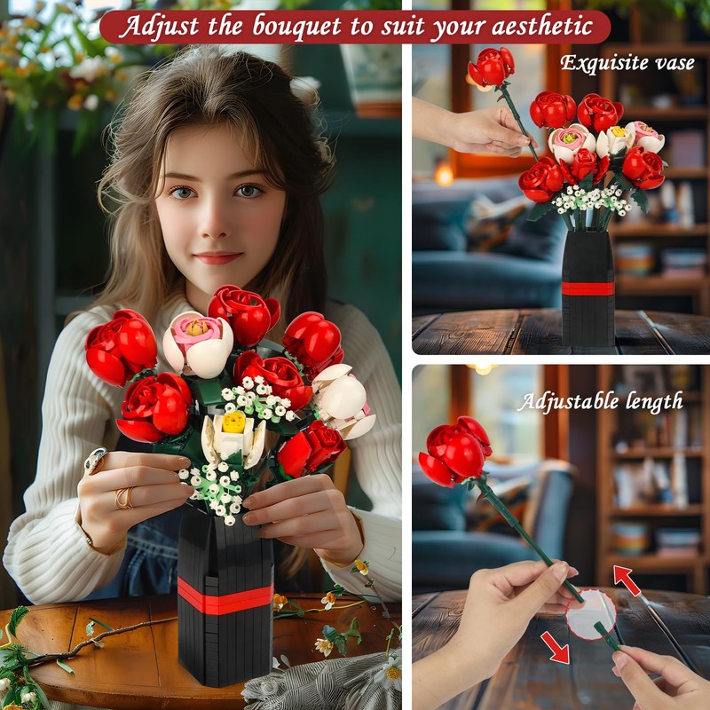 - Unique Romantic Gift: This unique rose bouquet building set is perfect for boys and girls of all ages. Each flower is carefully designed and the everlasting flowers symbolise eternal love. You can give this artificial bouquet to your family, partner and friends on major holidays such as Valentine's Day, Mother's Day, Thanksgiving, birthdays and Christmas. This unique and romantic gift can bring them unexpected surprise and happiness.