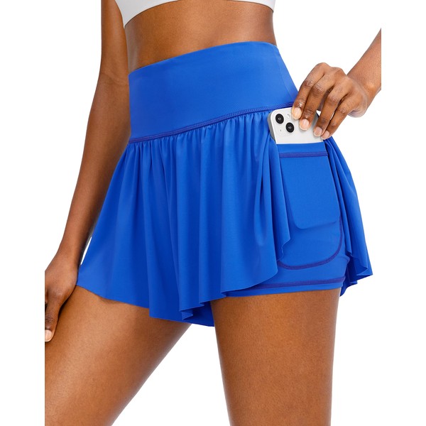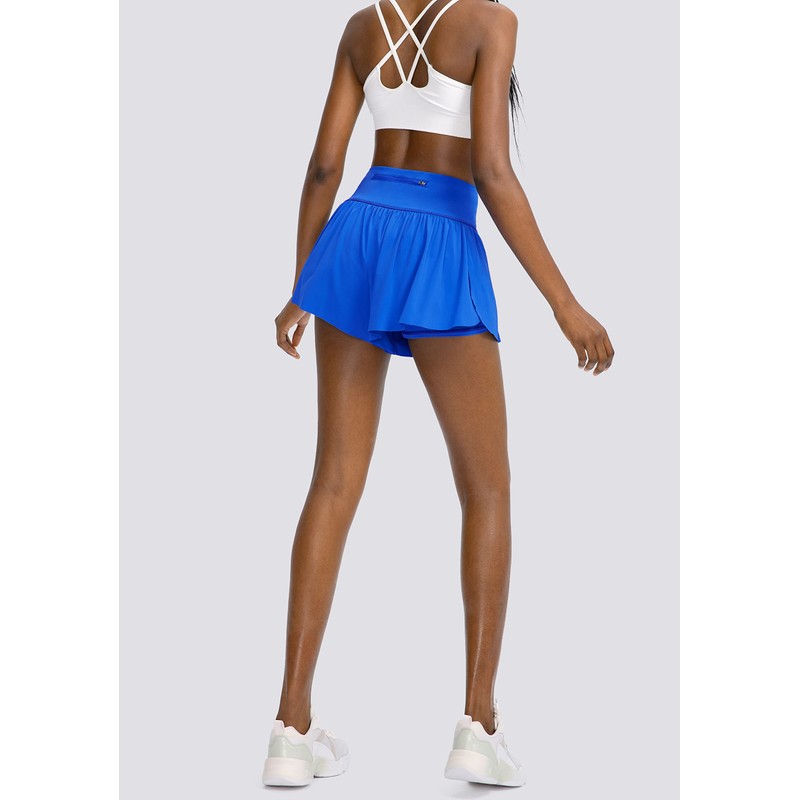 Pantalones cortos de correr para mujer con 4 bolsillos 2 en 1 de cintura alta para mujer, con mariposa, para entrenamiento, atletismo, falda de tenis, Azul, XXL