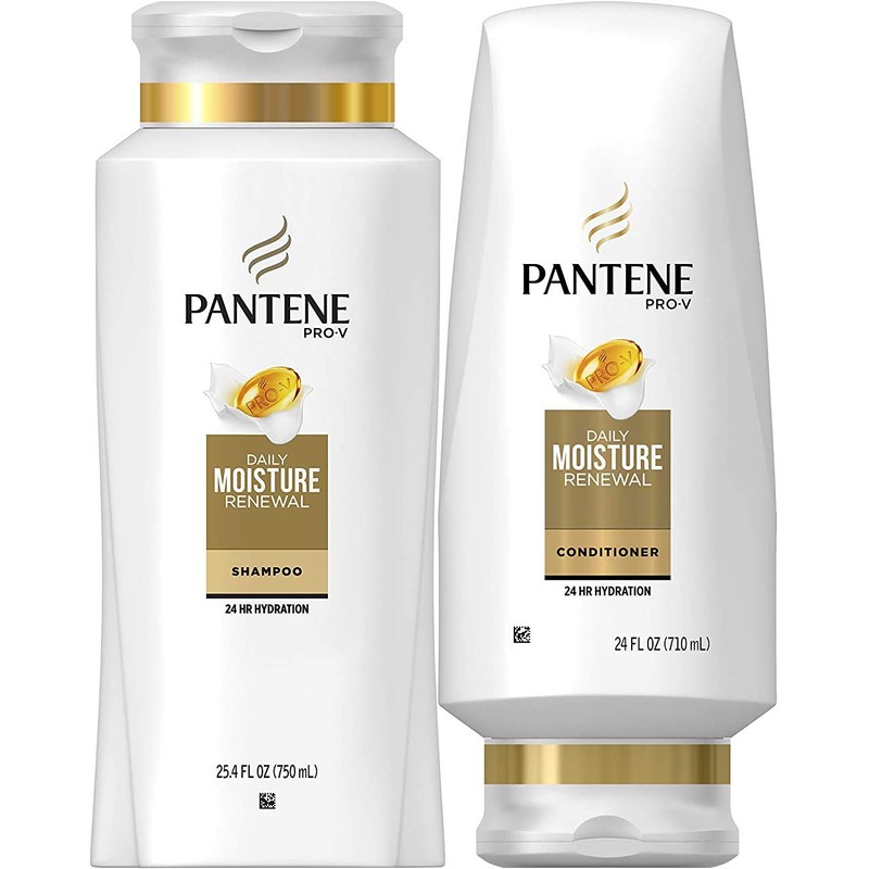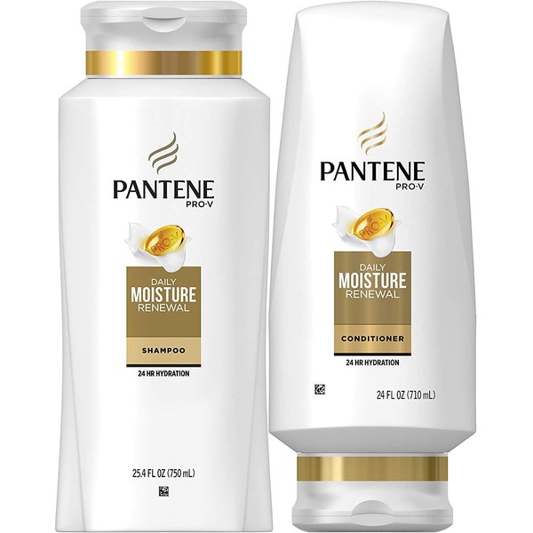 Pantene Moisturizing Shampoo 25.4 OZ and Silicon-Free Conditioner 24 OZ for Dry Hair, Daily Moisture Renewal, Bundle Pack (Packaging May Vary)