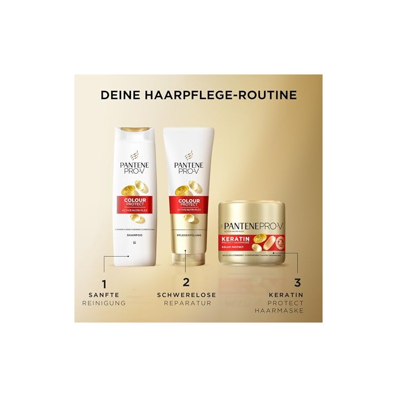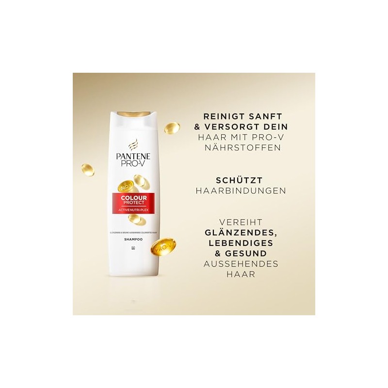 Entdecke das Pantene Pro-V Colour Protect Shampoo, die ultimative Pflege für lebendiges, gesund aussehendes colouriertes und gesträhntes Haar. Unsere sanfte Formel mit PRO-V und der innovativen ACTIVE NUTRI-PLEX-Technologie reinigt dein Haar und versorgt es mit essentiellen Nährstoffen. Zusammen mit unserer Pflegespülung hilft es, gefärbtes oder gesträhntes Haar zu reparieren und vor Stylingschäden zu schützen. Getestet vom Schweizerischen Vitamininstitut. Erlebe den ultimativen Haarpflegegenuss mit dem Pro-V Active Nutri-Plex Colour Protect Shampoo.