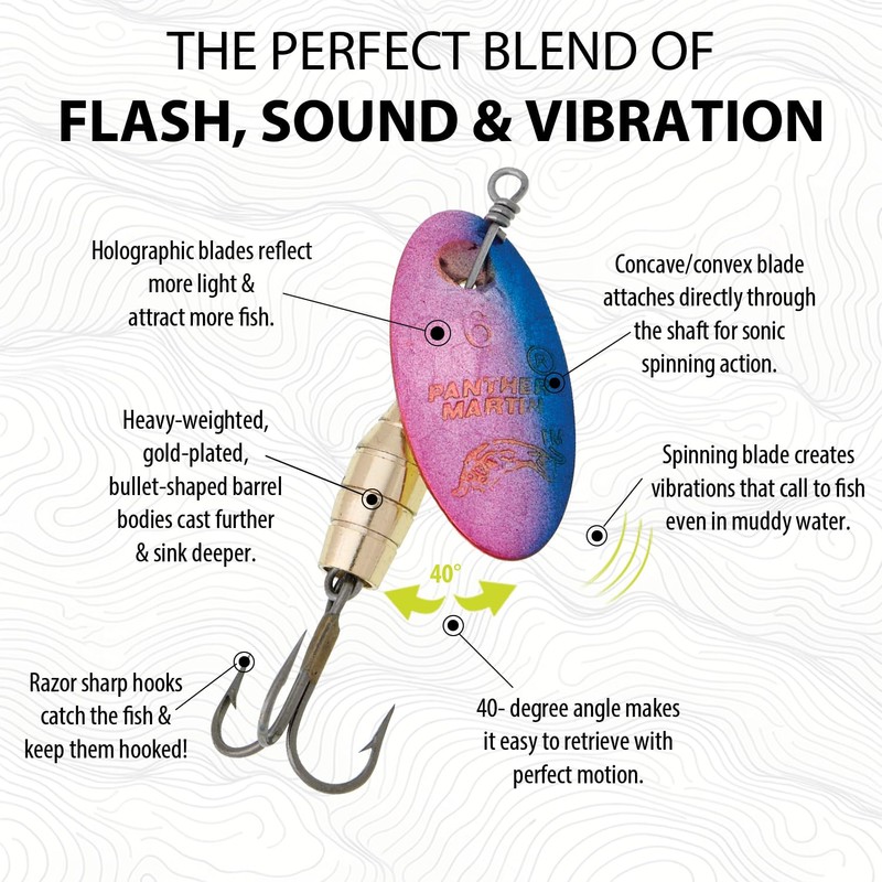 - 🐟 ✅ PANTHER MARTIN: ✅ Unique shaft through blade design creates easiest and fastest spinning action in the world. These holographic patterns combine rich blue, orange, green and golden colors with a translucent criss cross fish scale pattern.
