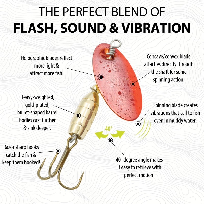 • 🐟 ✅ DELUXE HOLOGRAPHIC LURE: ✅ Convex/concave blades send out Sonic vibrations that are irresistible to fish. The beautiful holographic lures shimmer and quiver as the sun shines on them, allowing them to flash and flicker in the water.