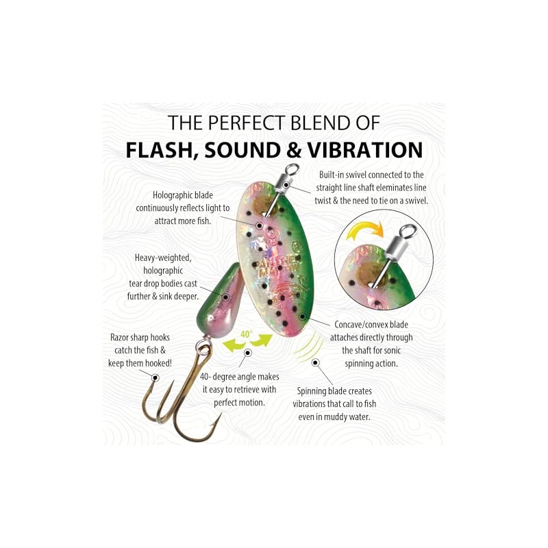 - 🐟 ✅ INLINE SWIVEL : ✅ Eliminates any line twist or need to tie on double eyelet swivel. Genuine Holographic blades & teardrop bodies.