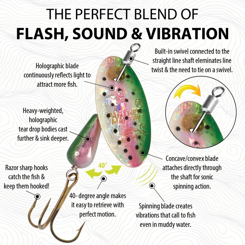 - 🐟 ✅ PANTHER MARTIN: ✅ Integrated swivels built in a straight line directly on the spinning shaft of the spinner. FISHING HOOK TYPE: Treble Hook