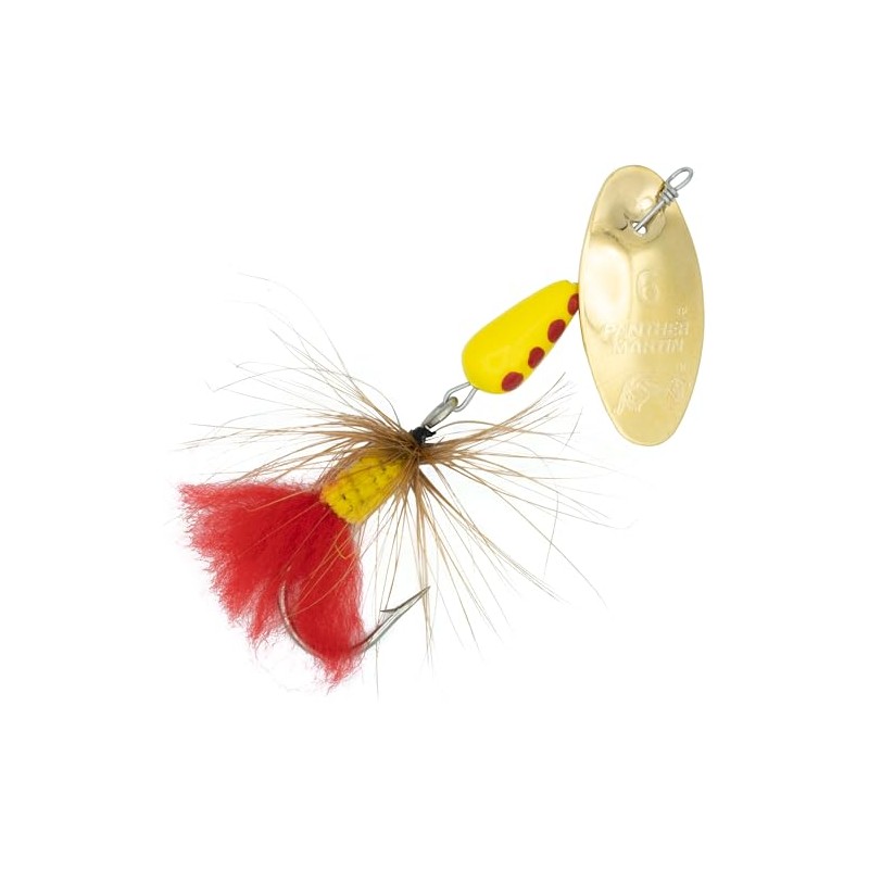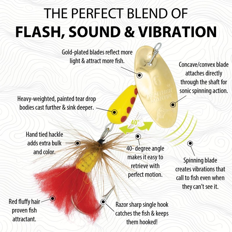 - 🐟 ✅ PANTHER MARTIN: ✅ Convex/concave blade sends out sonic vibrations that drive fish crazy. In the traditional single hook category, we are offering 2 NEW dressed fly styles. They use dressings that have always proved effective on Trout, Bass, and many other species.