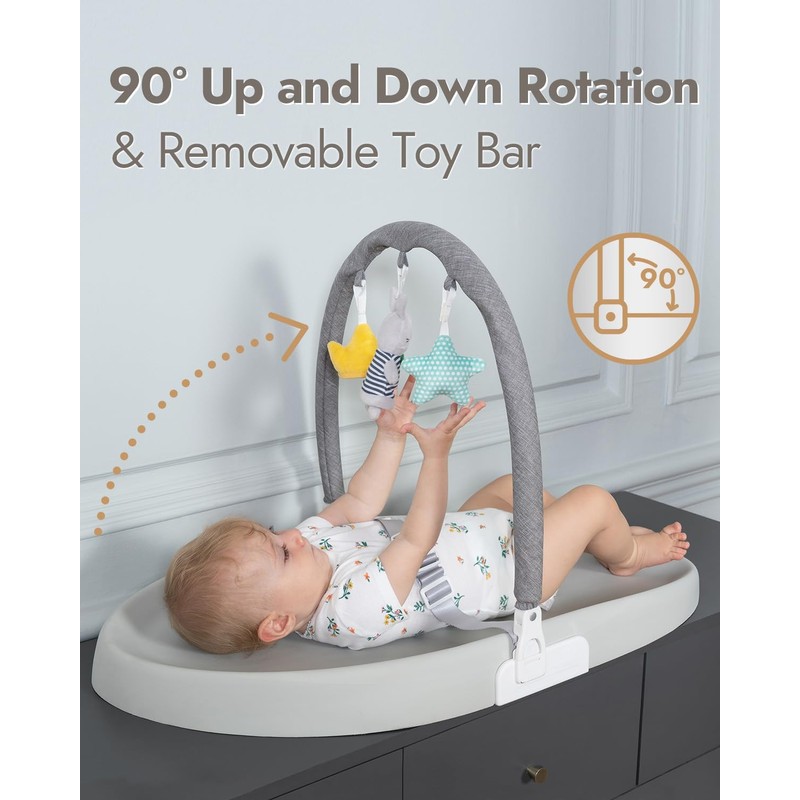 - 90° Up and Down Rotation & Removable Toy Bar: Includes a crown with a baby-safe mirror, a star with hidden crinkle paper, and a rabbit doll keeps the baby entertained. The toy bar attracts your baby to look, play and grasp while you change the diaper, and easy to store while not in use.