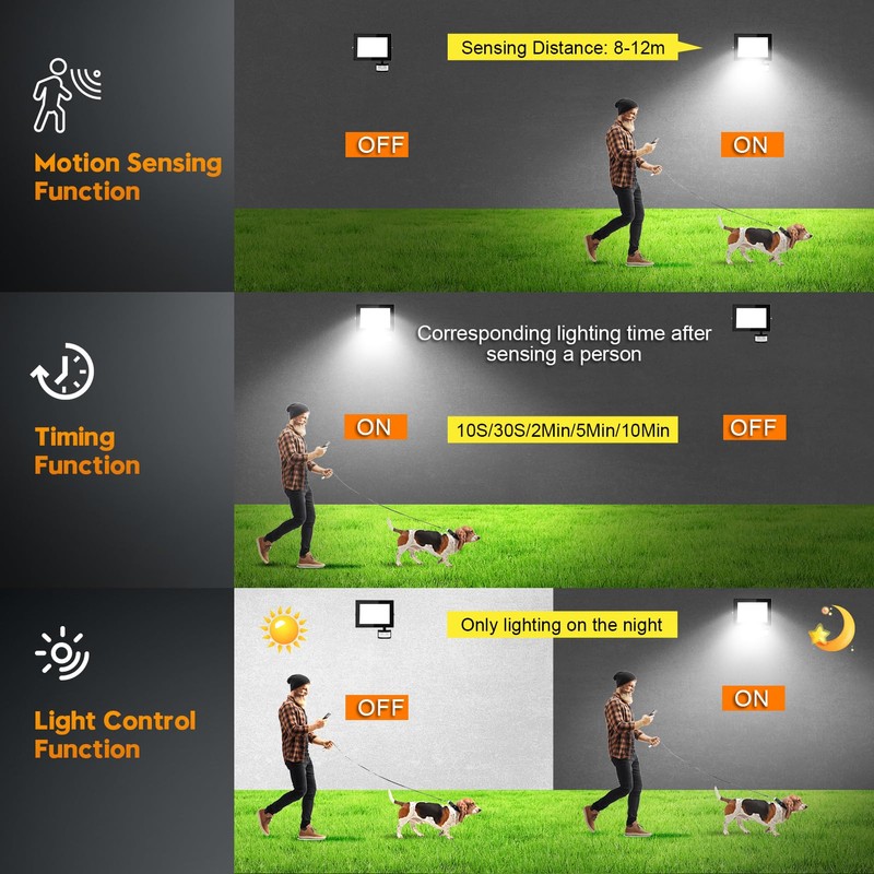 - Motion sensor: you can put the floodlight into motion detection mode by remote control. When motion is detected nearby, the light will automatically turn on and then off automatically.