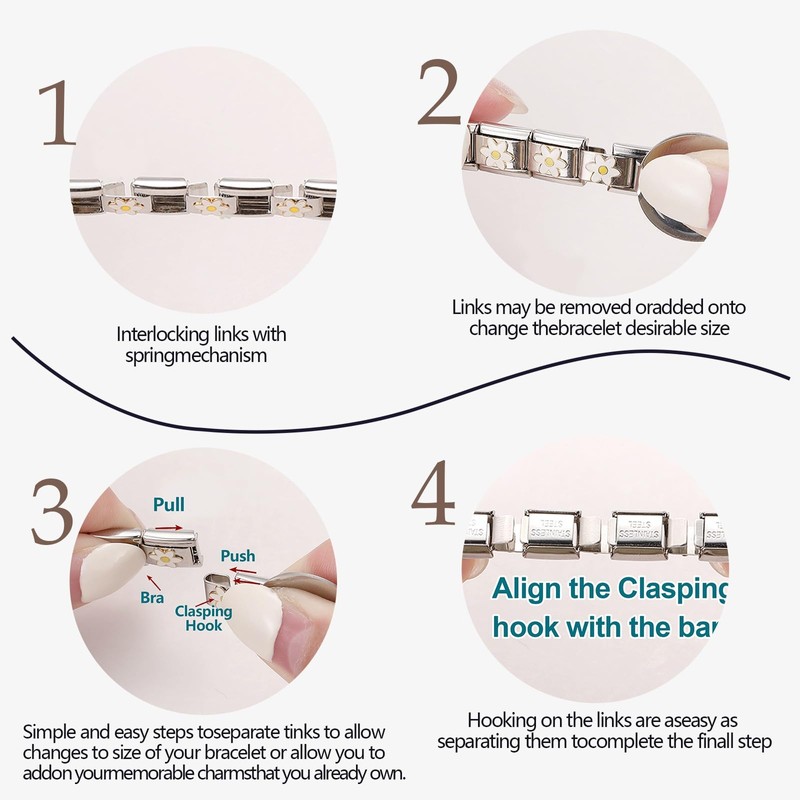 - 🎁Fácil de montar: los módulos de las pulseras italianas están diseñados para verse simples e intuitivos, lo que permite a los usuarios desmontarlos y reemplazarlos rápida y fácilmente.