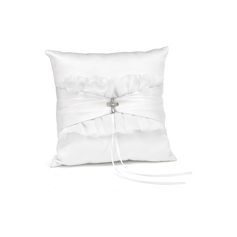 - Beautiful white satin pillow features a layer of gathered chiffon, covered by gathered satin and topped with a small, silver and pearl religious cross.