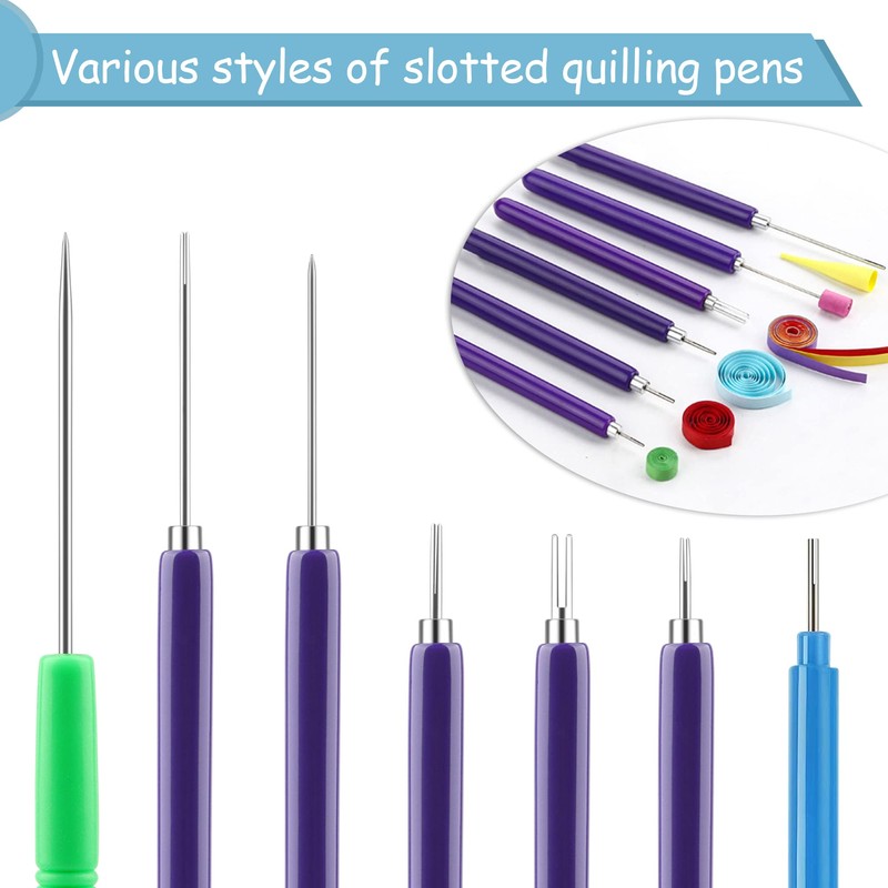 - 🌸PAKEAGE INCLUDE:This quilling tools kit comes with 7Pcs different sizes slotted needle pen, a pair of tweezers, scissors, curling coach.Various tools can meet your daily needs.
