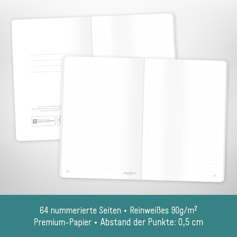• Flexible dot line: 64 numbered dotted pages offer versatile possibilities for writing, planning, sketching or as a mini bullet journal in a handy A6+ format.