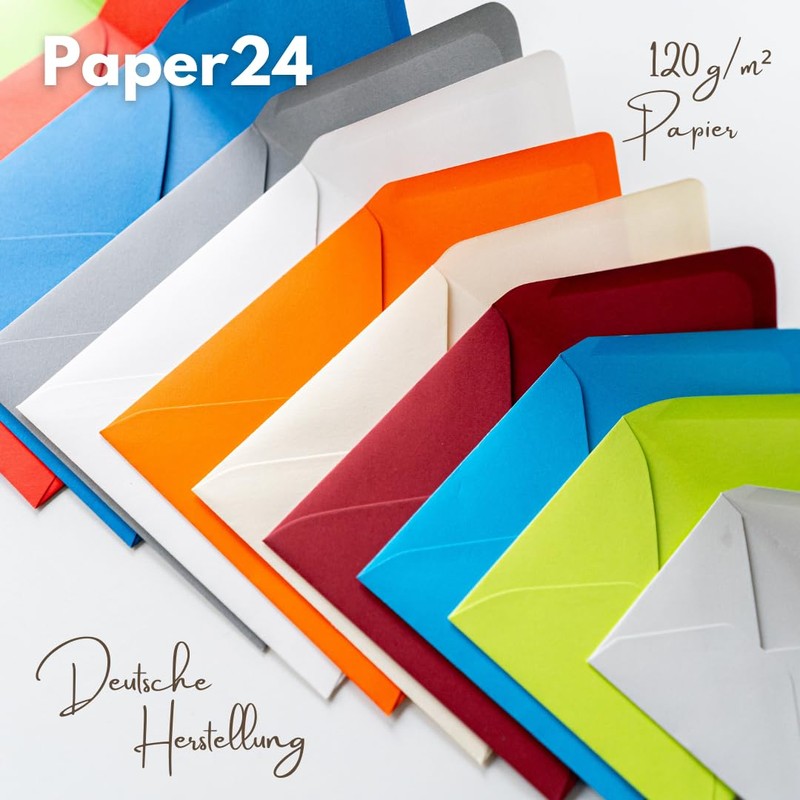 - Paper quality and workmanship: Paper24 is known for its consistently high quality and perfect workmanship. The envelopes in the format 155 x 155 mm are particularly robust and ideal for wedding cards in the format 148 x 148 mm or 150 x 150 mm.