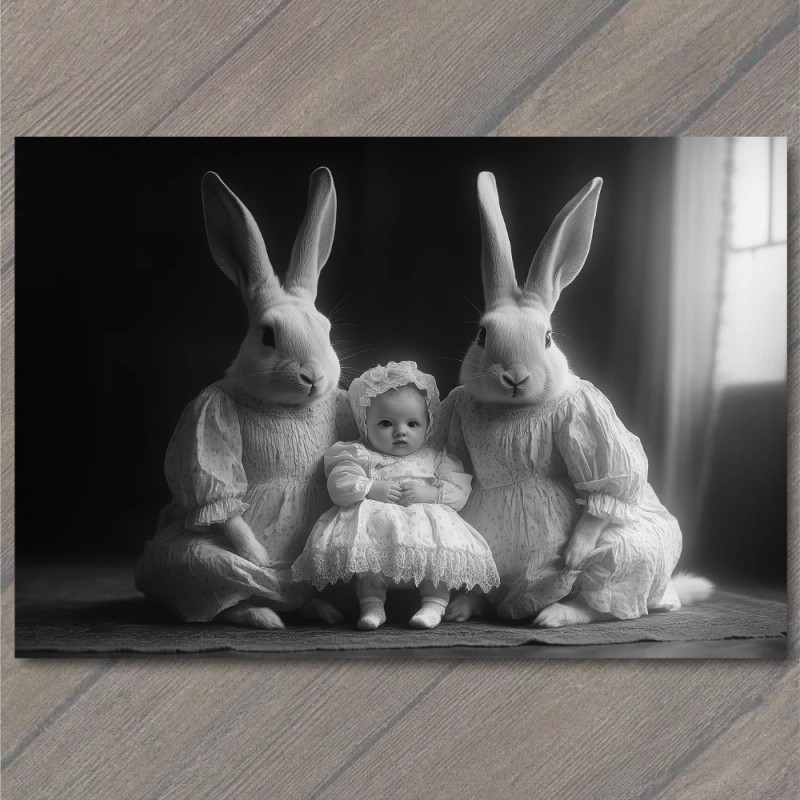 PaperMadDogScar POSTCARD Surreal Bunnies Baby Holding Victorian Odd Fantasy Creepy Weird Rabbit