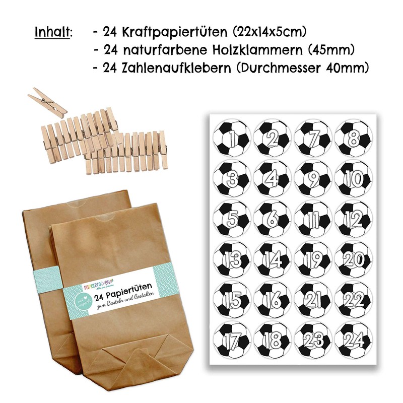 - The special advent calendar: you will receive a DIY Christmas calendar for filling with 24 kraft paper bags and 24 sticker numbers. Mini set design no. 47 footballs. Thanks to the self-adhesive motifs, you do not need any other utensils such as scissors or glue for crafting