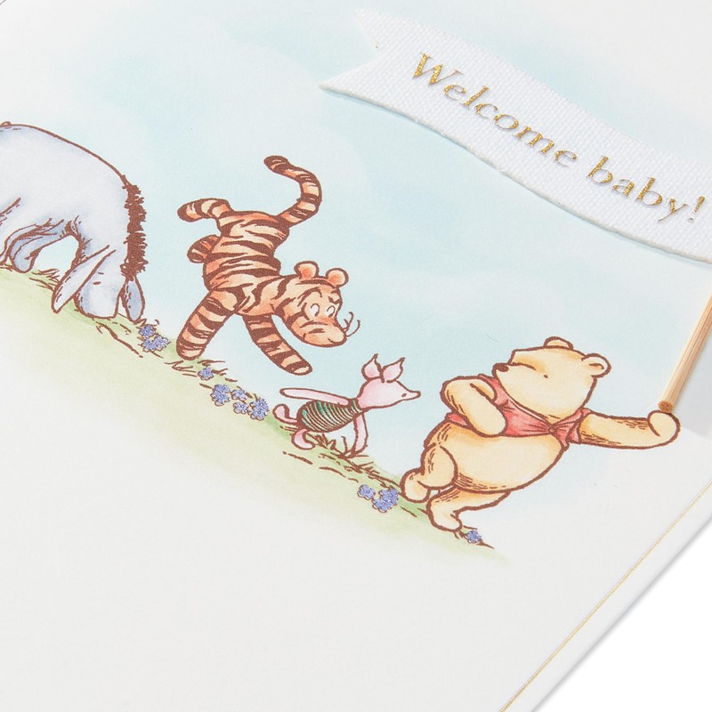 - Celebrate life's sweetest moments with this Papyrus Winnie the Pooh baby card, featuring fabric and wood attachments with shimmering foils. Perfect for any Disney enthusiast with a newborn