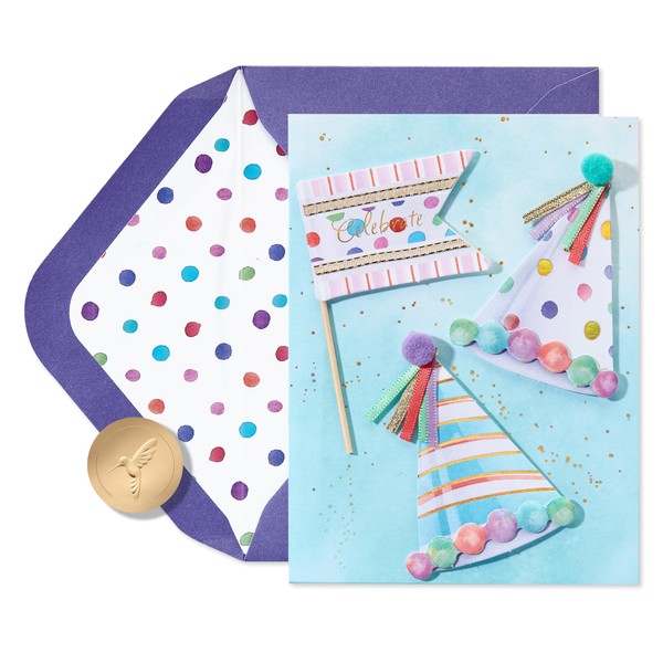 - Celebrate someone's special day with this fun Papyrus birthday card featuring party hats with pom-poms, shimmering foils, ribbon, wood attachments, embossing, and unique attachments