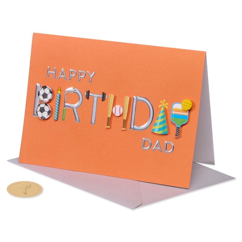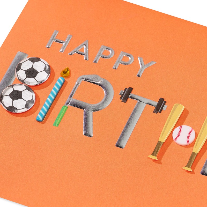 - This Papyrus birthday card features a playful array of sports icons including a soccer ball, golf tee, and baseball, enhanced with foil and epoxy for a standout look