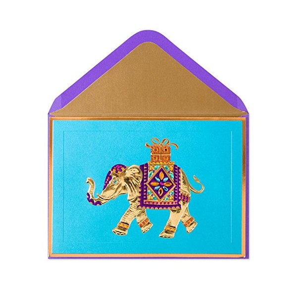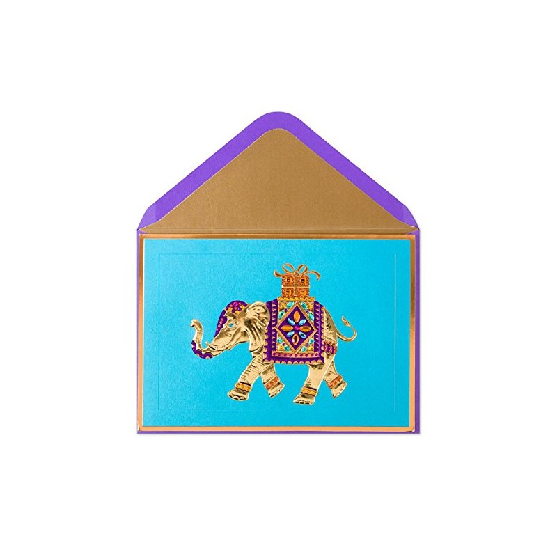 • An exotic gold elephant carries a special gift on this deep sky blue birthday card. Embossing and gems add dimension to the elephant.