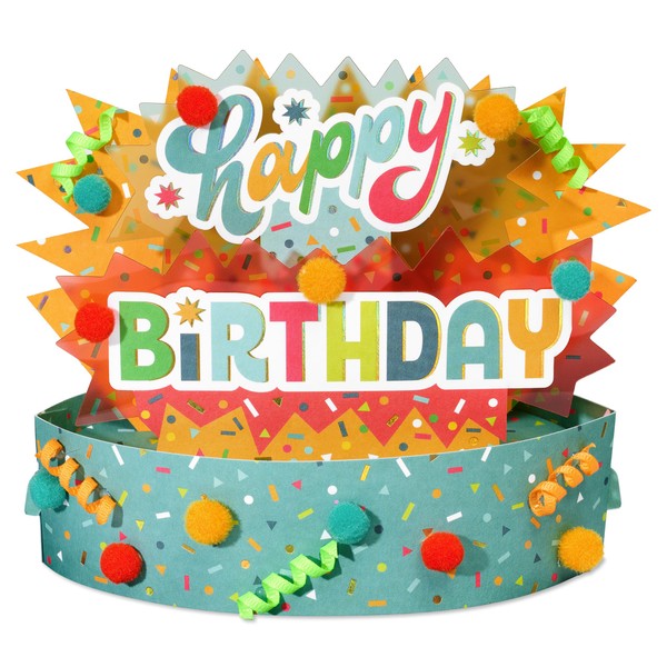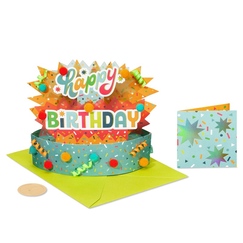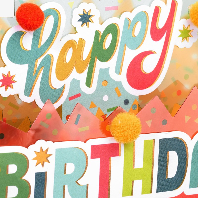 • This Papyrus birthday card features a displayable pop-up design, shimmering foils, pom-poms, ribbon, unique attachments, and a mini card with an uplifting birthday wish