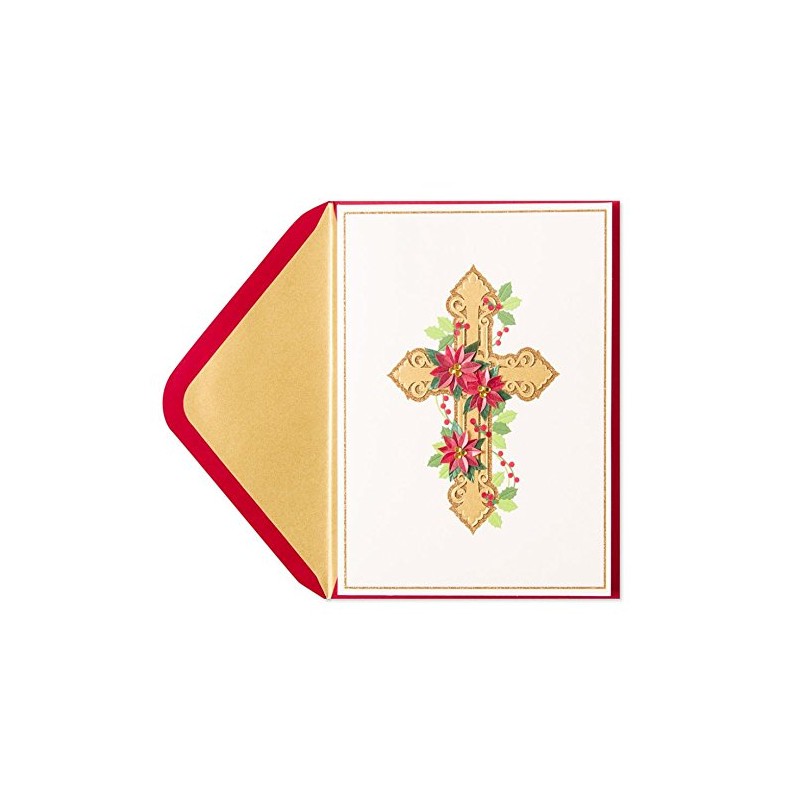 - Red poinsettias with gems hang on the ornate gold cross of this handmade Christmas card.