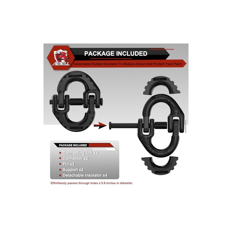 - Paquete: el paquete de 2 conectores de cadenas de remolque incluye todo lo que necesita, 4 eslabones de conexión; 2 conectores; 2 pasadores de transmisión; 4 insoladores desmontables. El exquisito embalaje protege bien el producto, también puedes regalarlo a tus amigos.