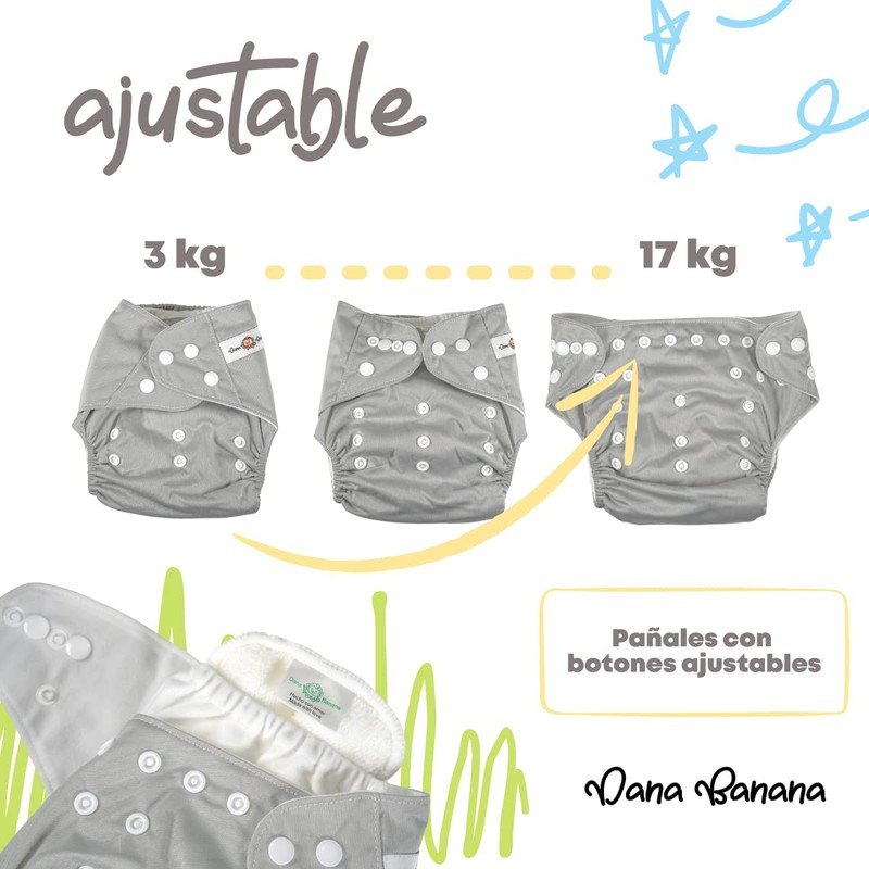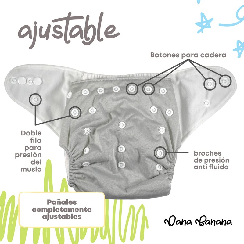 Paquete de 5 Pañales Ecológicos B de Tela Premium Dana Banana + 5 Insertos de Cuatro Capas con Fibra de Bambú Dana Banana Unisex – Unitalla – Ajustables – Lavables – Reutilizables