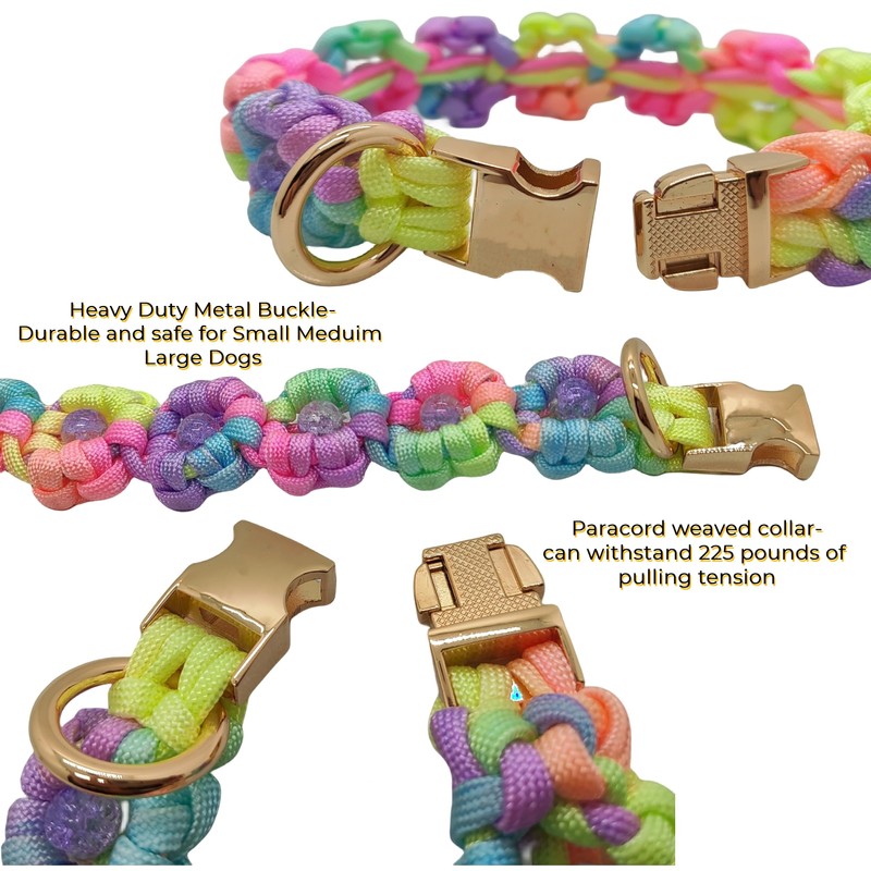 Paracord Flower Dog Collar Hand Weaved,Spring Flowers Pet Collars with Quick release Buckle, fit for Small Medium Large Extra Large Dogs,Strong & Comfort (L-neck 12.5~13.5", Pink-Rainbow 2)