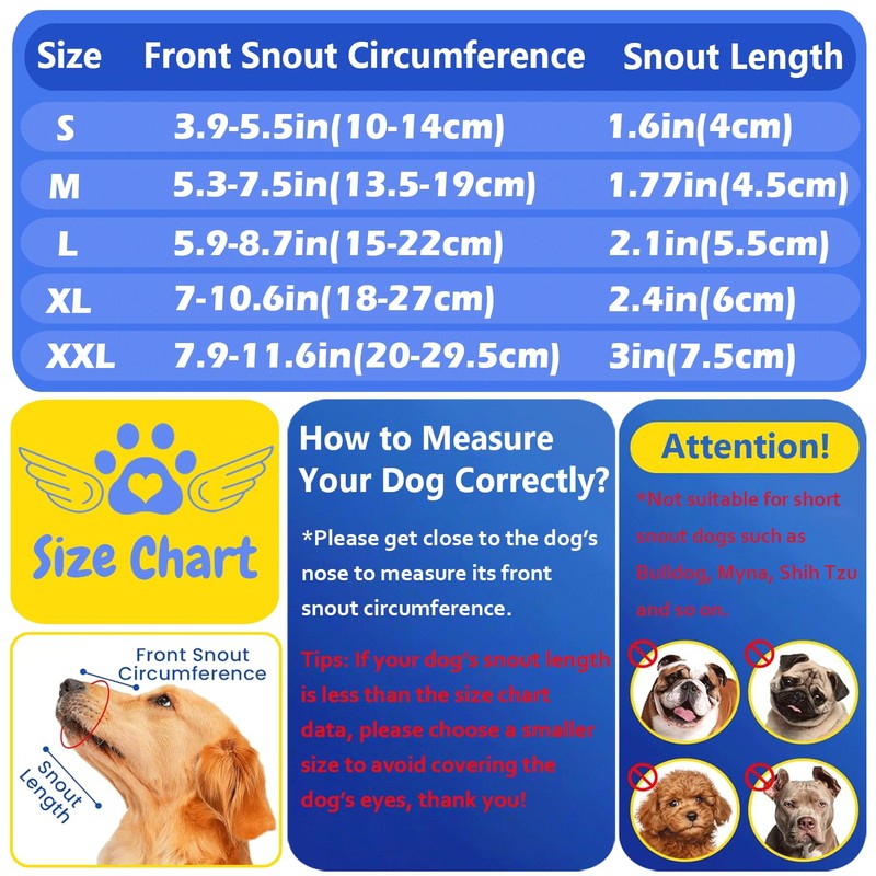 3.If your dog snout length is less than the size chart data, please choose a smaller size to avoid covering the dog’s eyes.