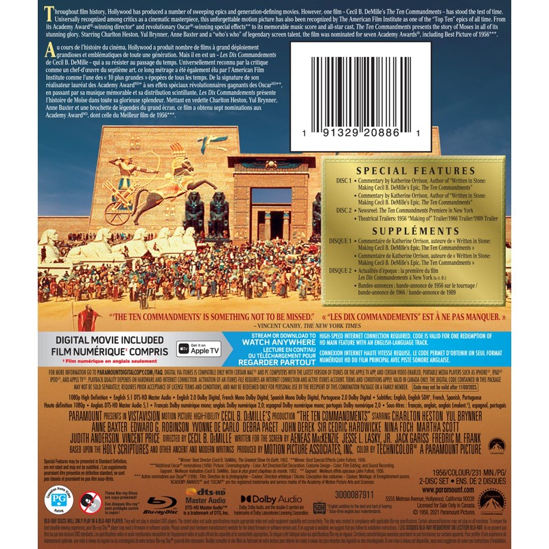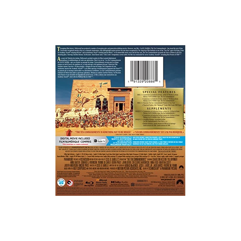 Cecil B. DeMille's final film was this grand-scale religious epic starring Charlton Heston as Moses, an adopted Egyptian prince chosen by God to abandon a life of luxury and lead his fellow Israelites out of slavery. The flight from Egypt, the parting of the Red Sea, and Moses' receiving of the Commandments are among this classic film's many highlights. With Edward G. Robinson, Yul Brynner, Anne Baxter, Yvonne de Carlo, and a cast of thousands. 3 3/4 hrs. Widescreen (Enhanced); Soundtracks: English Dolby Digital 5.1, Dolby Digital stereo Surround, French Dolby Digital mono, Portuguese Dolby Digital stereo Surround, Spanish Dolby Digital mono; Subtitles: English, French, Portuguese, Spanish; audio commentary; newsreel footage; theatrical trailers. Two-disc set.