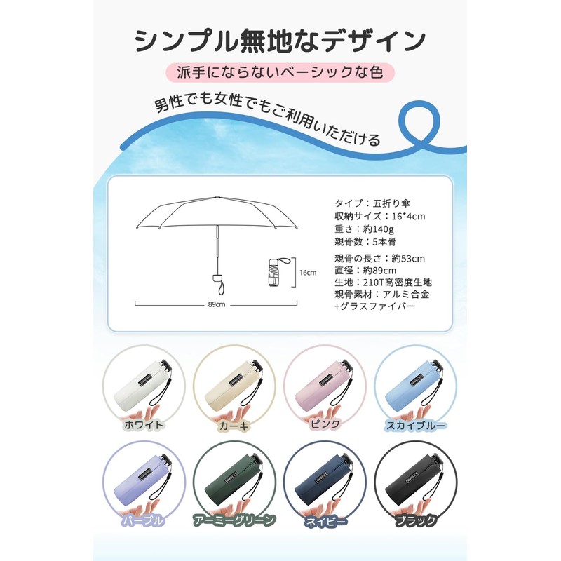 The ultra-lightweight 140g folding umbrella is perfect for everyday carry. It has UV protection and blocks light and heat to protect your skin from strong sunlight. The compact size makes it easy to store in your bag, and it can handle sudden changes in weather. Unisex design, simple but highly functional. It also serves as a sun protection due to its UV blocking effect. It is lightweight, yet well built and durable. The handle is designed to be easy to grip and it is characterized by preventing fatigue even when used for a long time. A practical item that can be used for a variety of occasions, such as commuting to work or school, shopping, etc.