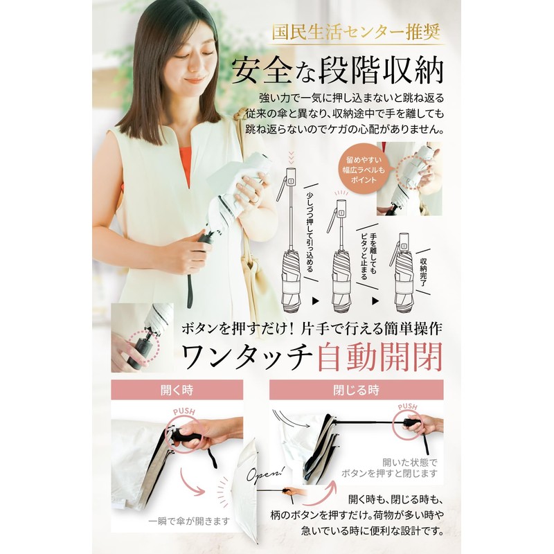 • Recommended by National Life Centers. Automatic Opening and Closing Folding Umbrella with Prevent Pop-out: Common folding umbrellas risk injuries due to bouncing back when storing umbrellas patterns. This product includes a safety stopper to prevent bouncing back and greatly improve safety and light power. It is safe to use to specifications recommended by the National Life Center. In addition, it can be opened and closed automatically with one touch, so you can open and close it with one hand without any stress